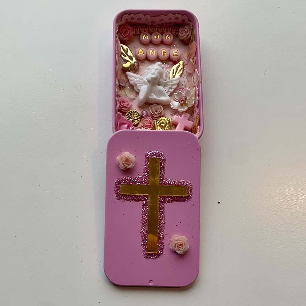À l’intérieur, une composition délicate associe une figure d’ange protecteur, des images pieuses et des ornements floraux soigneusement assemblés, créant un espace sacré propice au recueillement et à la spiritualité personnelle.
