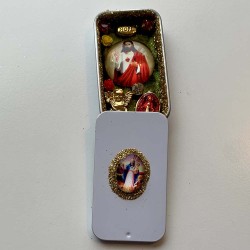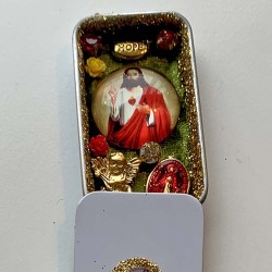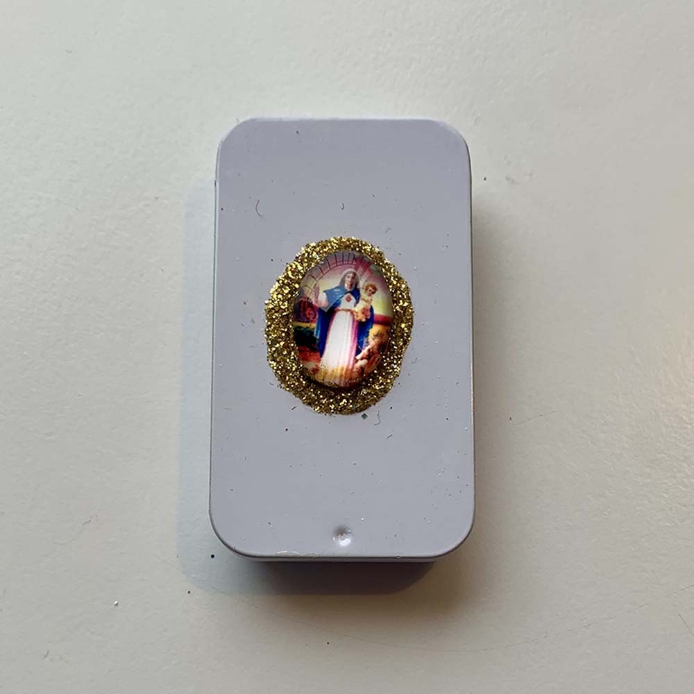 Cet autel de poche est un autel religieux miniature, conçu comme un espace de prière et de protection à emporter avec soi. Inspiré des autels d’église et des ex-voto traditionnels, il se présente dans une petite boîte métallique facile à transporter.