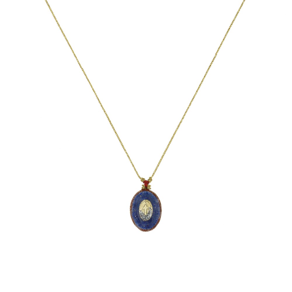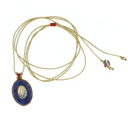 Ce collier avec médaillon ovale petit modèle, sublimé par une madone et un contour en émail poudré or, réalisés avec un savoir-faire artisanal unique.