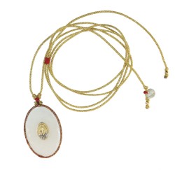 Ce médaillon séduit par sa pureté visuelle et sa lumière subtile, obtenues grâce à un émail blanc lumineux, sublimé par un contour en émail poudré or, évoquant délicatesse et équilibre.