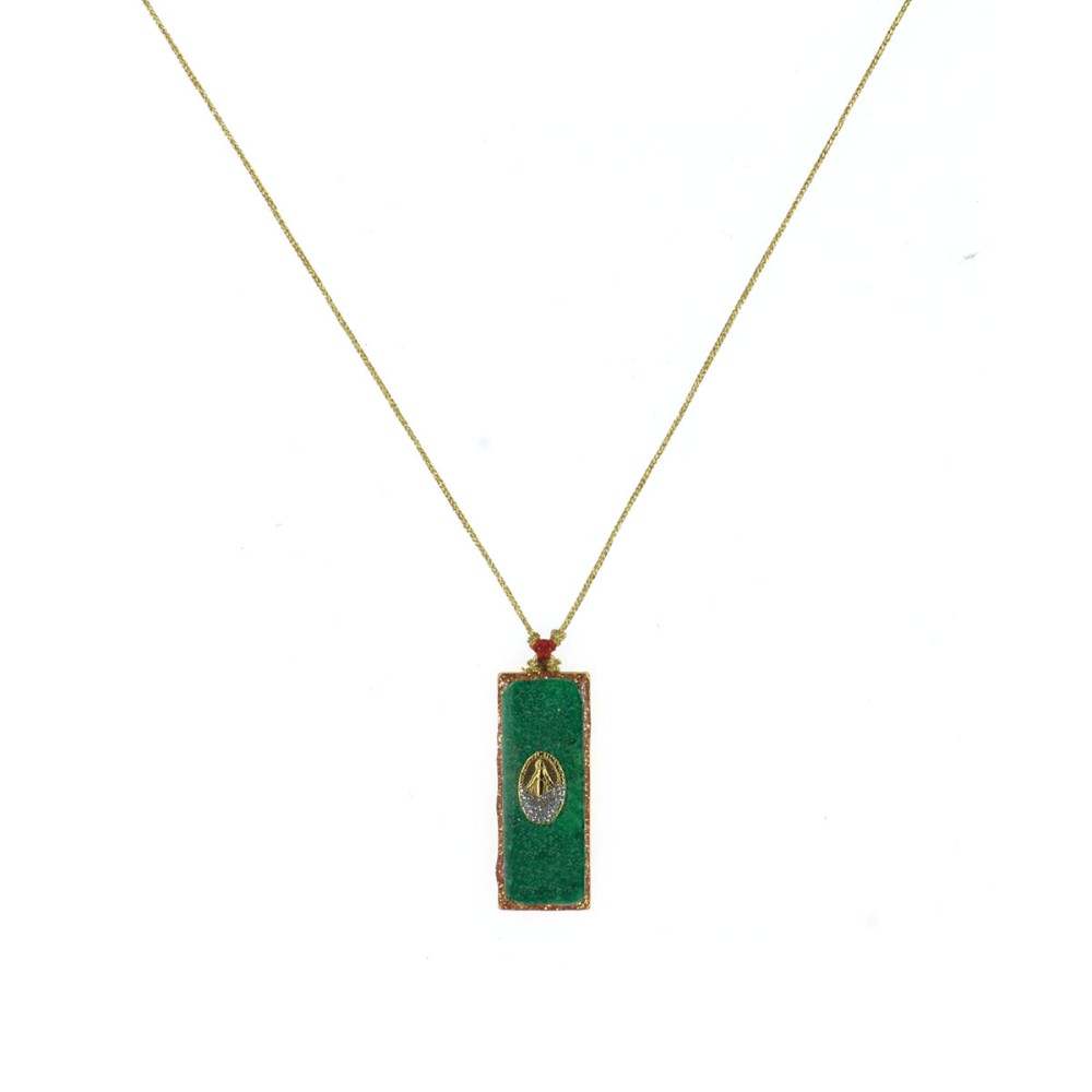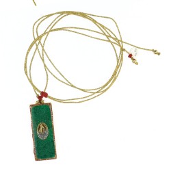 Ce collier avec une barrette sublimé par une madone et un contour en émail poudré or, réalisés avec un savoir-faire artisanal unique.