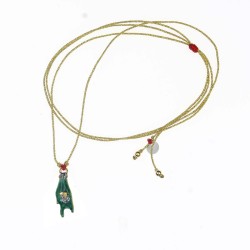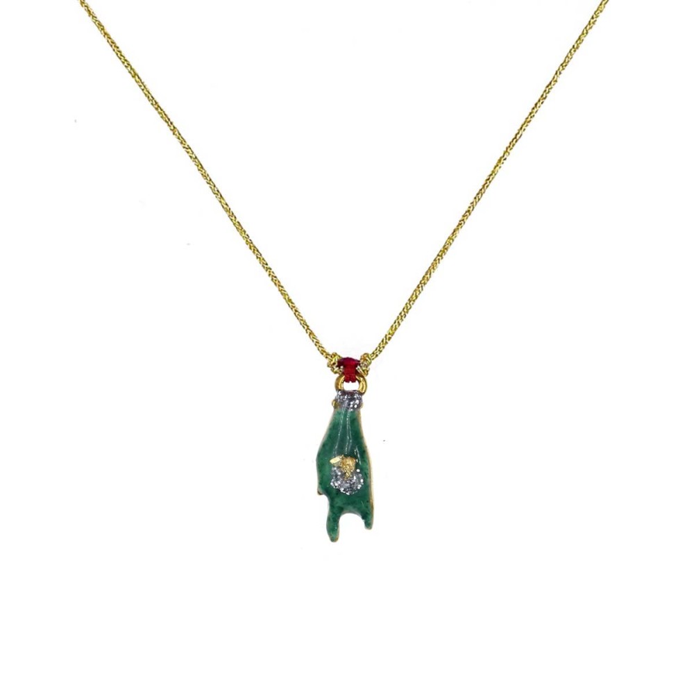 Collier "Mano cortuno" émaillée à la poudre de malachite, révélant des nuances vert profond et des marbrures uniques, monté sur cordon Or.