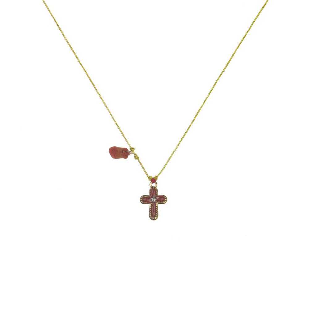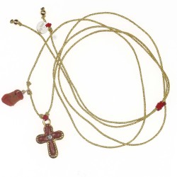 Collier Croix monté sur cordon Or, émaillée avec de la pierre de corail que je réduis en poudre.