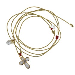 La croix est montée sur un cordon doré ajustable, agrémenté d’une petite pierre de nacre.