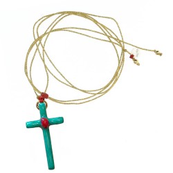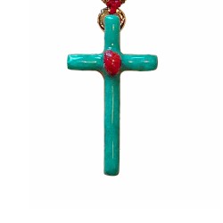 Croix artisanale au charme singulier, la Lumi Sacri séduit par son fond émaillé turquoise rehaussé en son centre de corail.