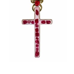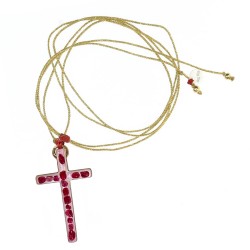 Lumi Sacri "lumière sacré"est une croix artisanale au charme singulier, sublimée par un fond émaillé rubis clair et rehaussée de pierres rubis aux reflets lumineux.