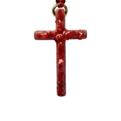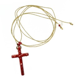 Lumi Sacri "lumière sacré" est une croix artisanale au charme singulier, sublimée par un fond émaillé corail et rehaussée de pierres corail