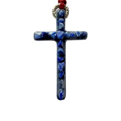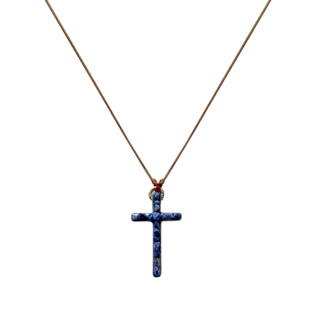 Lumi Sacri "lumière sacré"est une croix artisanale au charme singulier, sublimée par un fond émaillé Lapis Lazuli et rehaussée de pierres de Lapis Lazuli aux reflets lumineux.